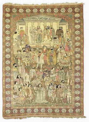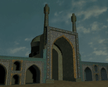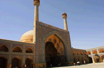 位於伊斯巴罕國王廣場的大清真寺。上面點綴著幾何學般的植物花紋,和依據阿拉伯文字創造的花紋,也就是所謂的阿拉伯式裝飾圖案,可以稱得上是伊斯蘭美術的極致。